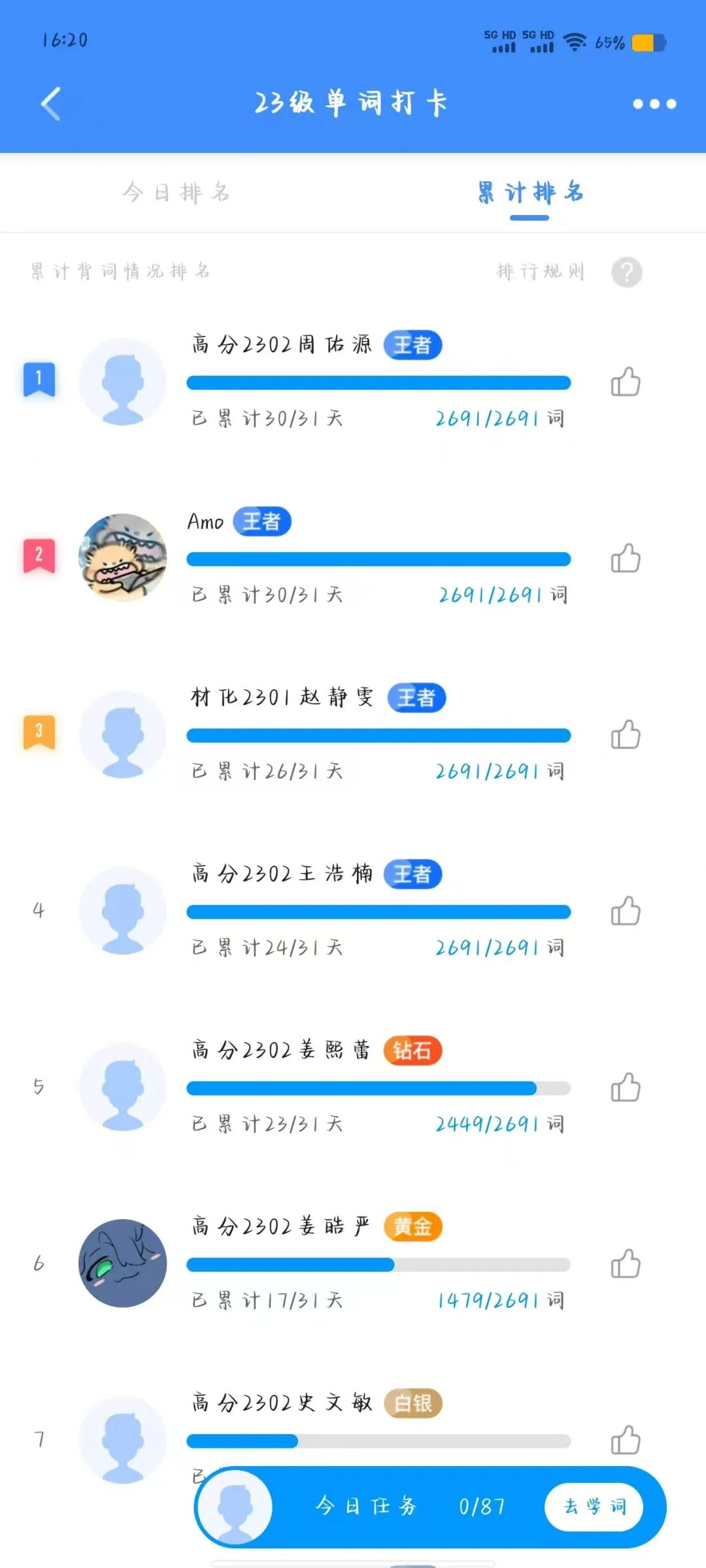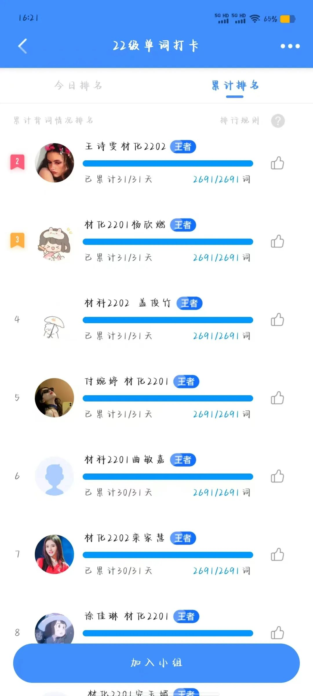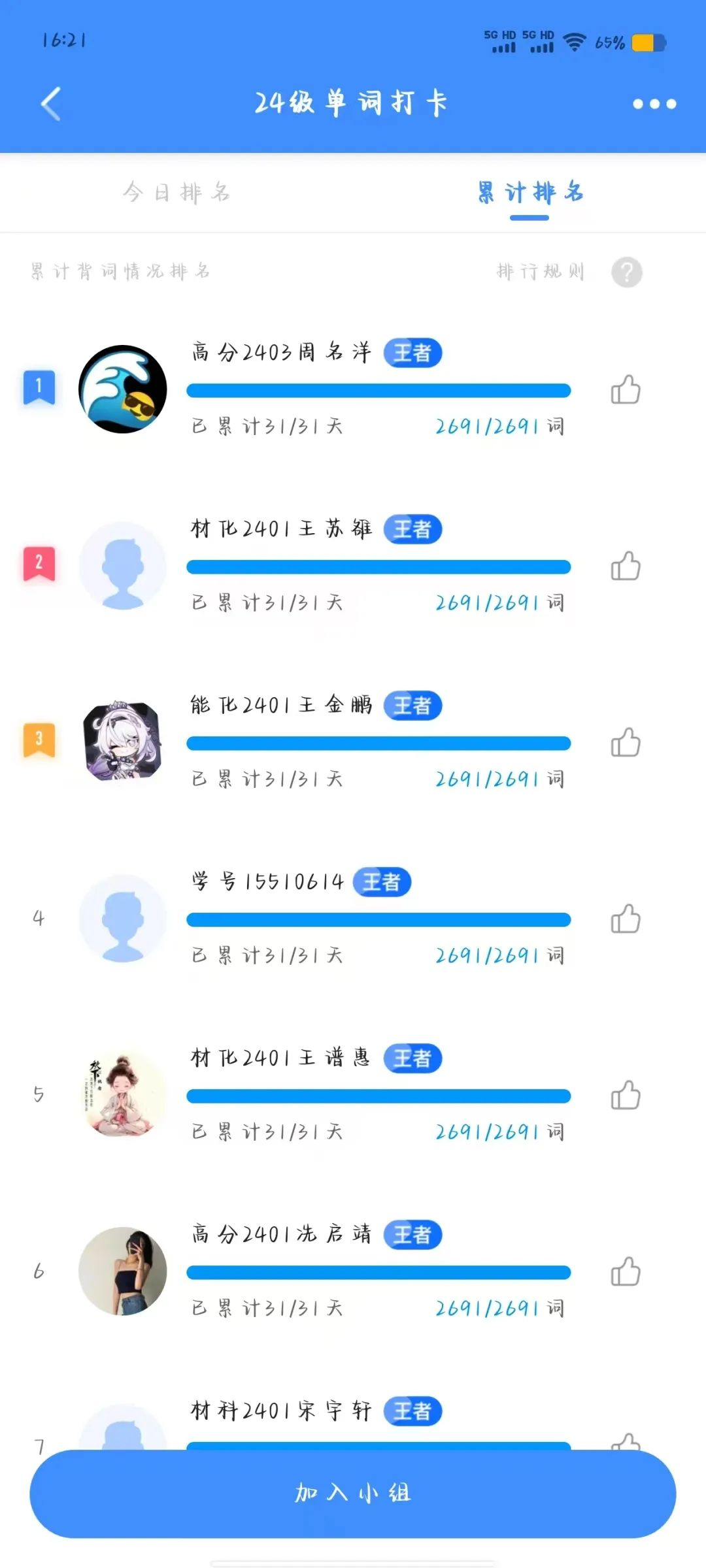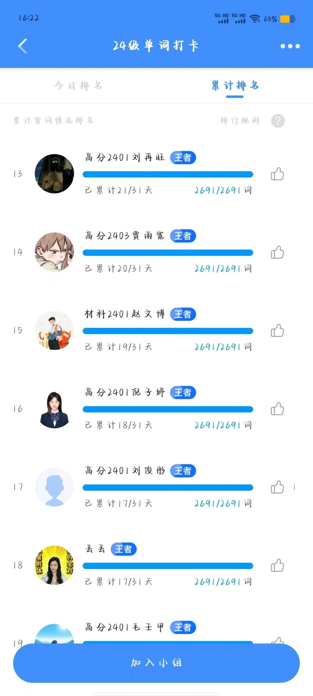 为了帮助学生养成良好的学习习惯,增强自律学习意识,更好地备战四六级考试,提高四六级通过率。我院于11月7日开展乐词英语打卡活动,22级、23级和24级的同学参与本次活动。通过线上背单词打卡的形式开展,要求每位同学每天在乐词APP上完成打卡任务,由学习部建立单词打卡群,确定参加人员名单。