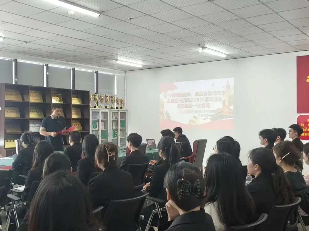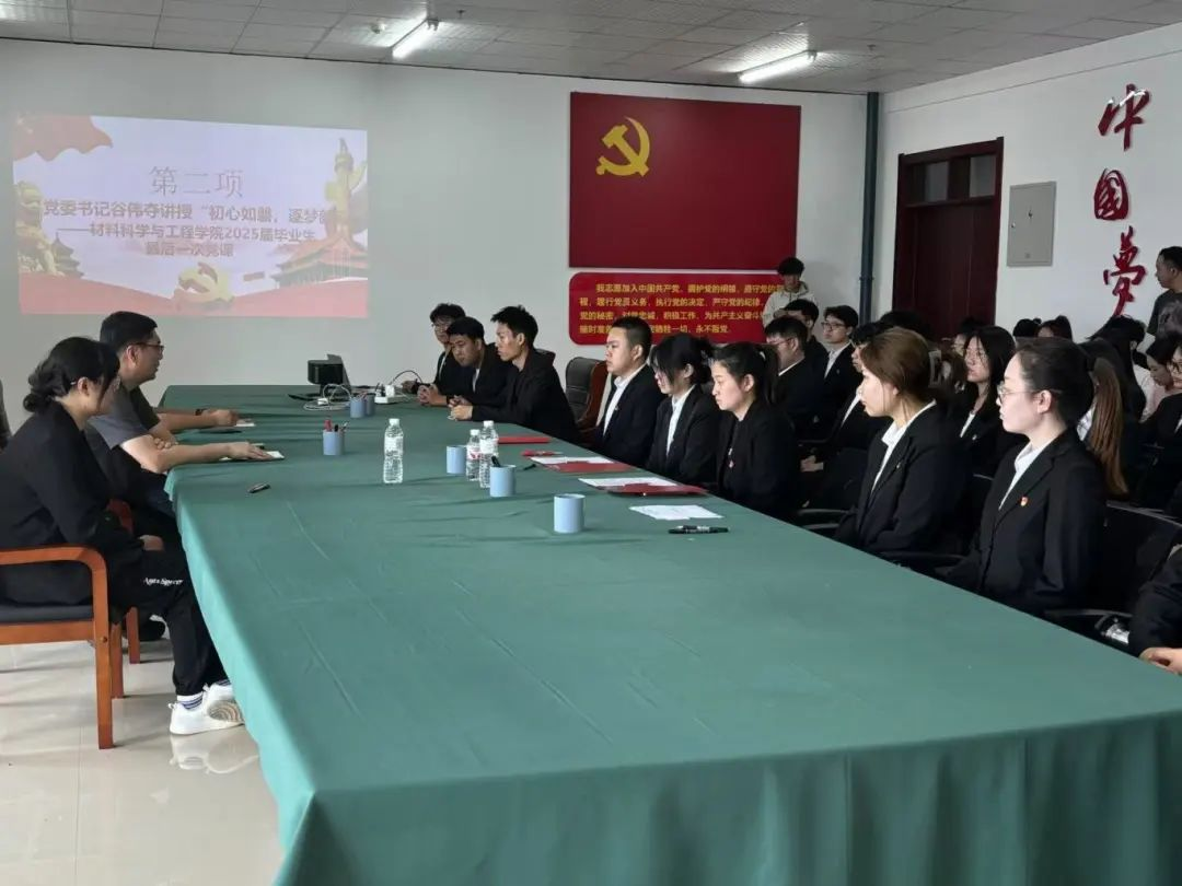 为强化毕业生党员的理想信念教育,让毕业生党员牢记党员身份,永葆初心本色,在奔赴祖国各地的新征程上勇担时代使命。材料科学与工程学院学生党支部于2025年6月17日在工训大楼1211室开展以“初心如磐担使命,踔厉奋发向未来”主题党日活动暨2025届毕业生党员最后一次党课。学院党委书记谷伟夺、学生党支部书记张清文、周奕彤以及2025届全体毕业生党员共同参加。