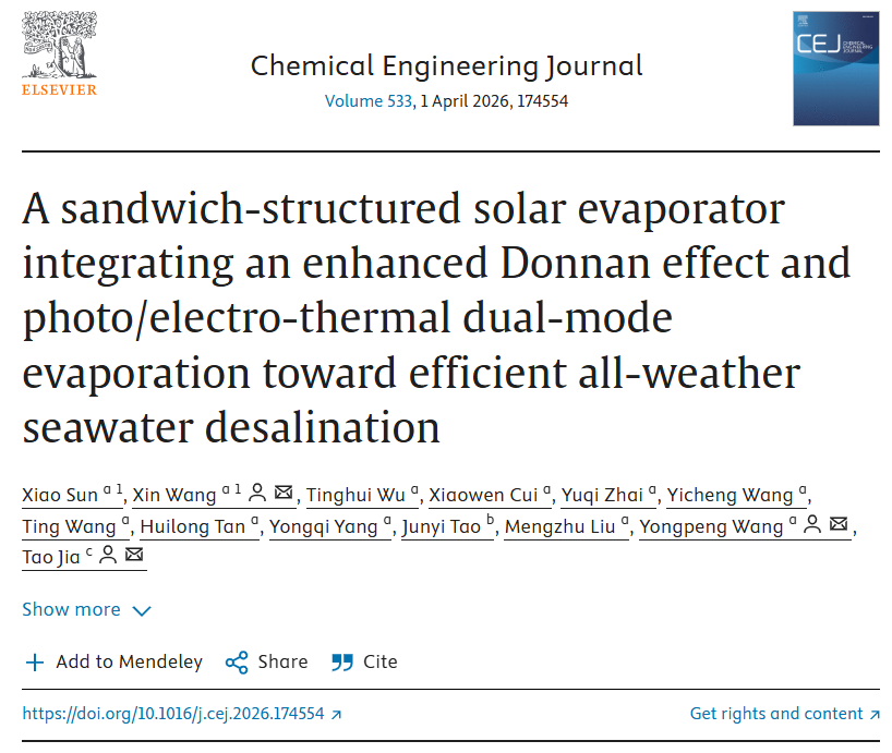 近期,我院研究团队在化工领域权威期刊《Chemical Engineering Journal》(中科院一区Top期刊,影响因子13.2)上发表题为“A sandwich-structured solar evaporator integrating an enhanced Donnan effect and photo-electro-thermal dual-mode evaporation toward efficient all-weather seawater desalination”的最新研究成果。该研究创新性地设计了一种三层“三明治”结构太阳能蒸发器,通过集成增强的唐南效应(Donnan effect)与光电热双模蒸发机制,成功突破了传统技术的时空限制。