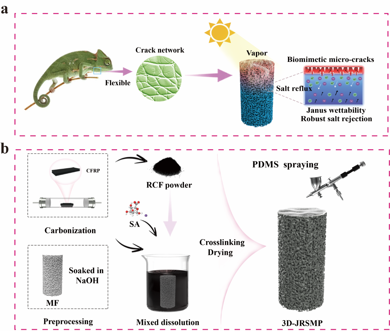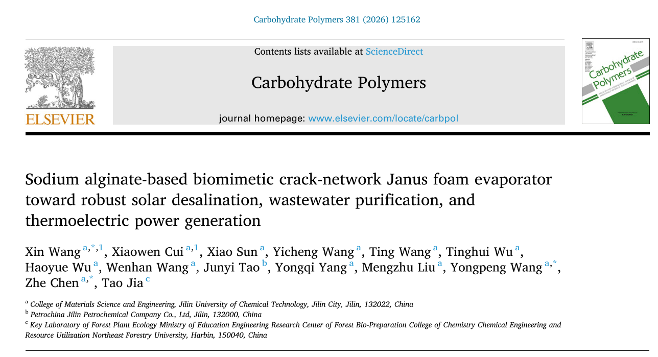 近期,我院王鑫老师在《Carbohydrate Polymers》(2025年影响因子IF:12.5,中科院化学一区Top期刊)发表“Sodium alginate-based biomimetic crack-network Janus foam evaporator toward robust solar desalination, wastewater purification, and thermoelectric power generation”学术论文。该研究受变色龙皮肤裂纹网络启发,开发了一种具有工程化微裂纹的三维Janus泡沫蒸发器(3D-JRSMP)。该仿生设计协同集成了三大要素:(i)废弃物衍生的回收碳纤维用于可持续光热转换;(ii) Ca²⁺交联的海藻酸钠水凝胶通过中间水结构调控促进低焓蒸发;(iii)仿生裂纹网络结构实现强效毛细作用、结构回弹性和自发抗盐沉积。